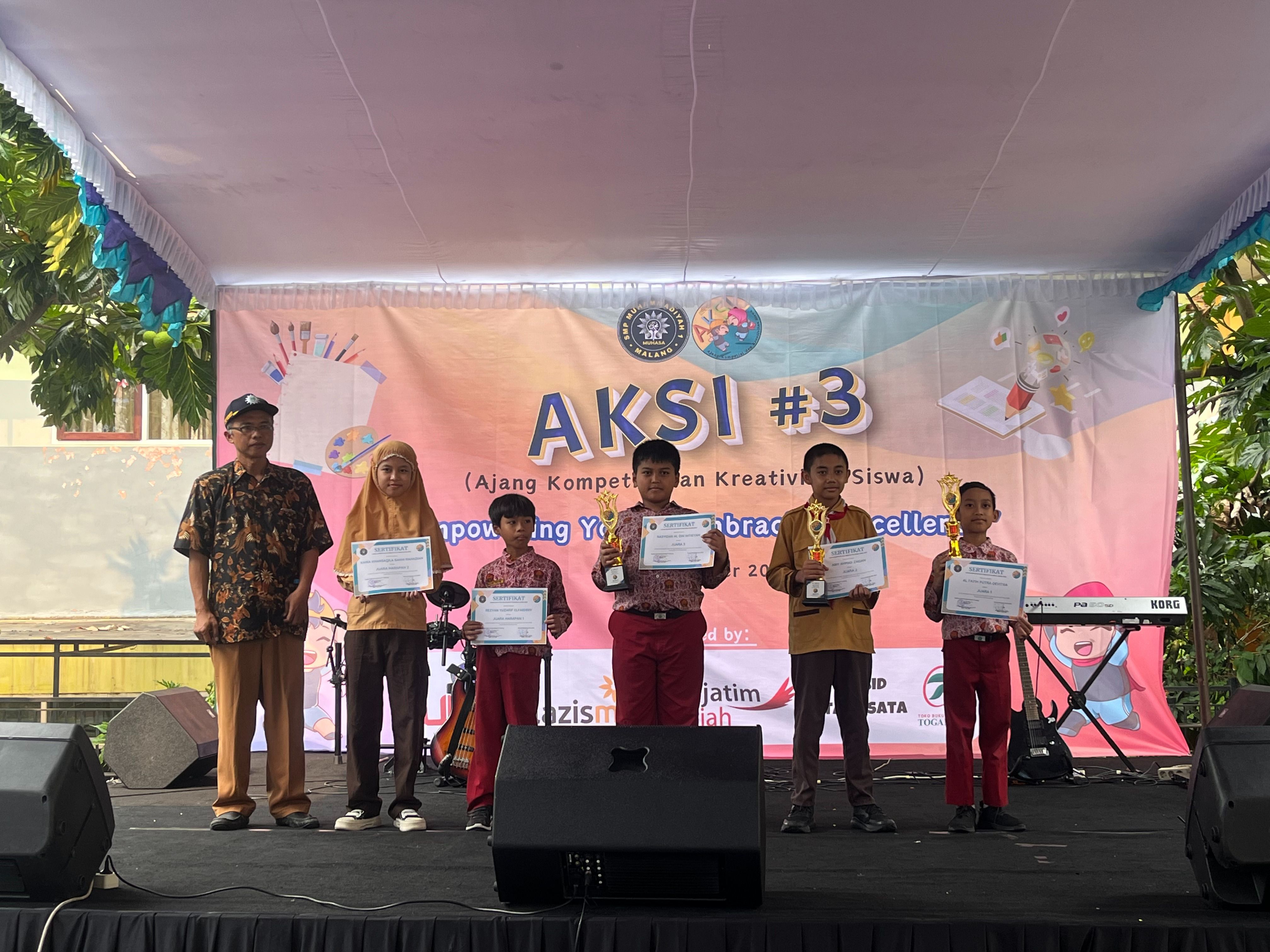 AKSI merupakan agenda tahunan SMP Muhammadiyah 1 Malang sebagai wadah pengembangan bakat, kreativitas, dan kompetensi siswa. Kegiatan ini menghadirkan beragam lomba di bidang akademik, seni, keagamaan, dan olahraga, yang bertujuan menumbuhkan prestasi, sportivitas, kepemimpinan, serta karakter Islami dalam suasana kompetitif yang sehat dan menyenangkan.
